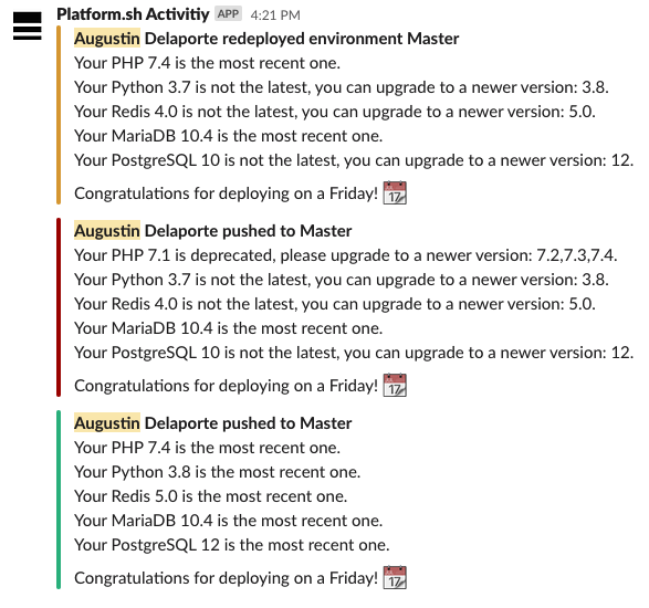 * You must first configure a Platform.sh variable named "SLACK_URL".
